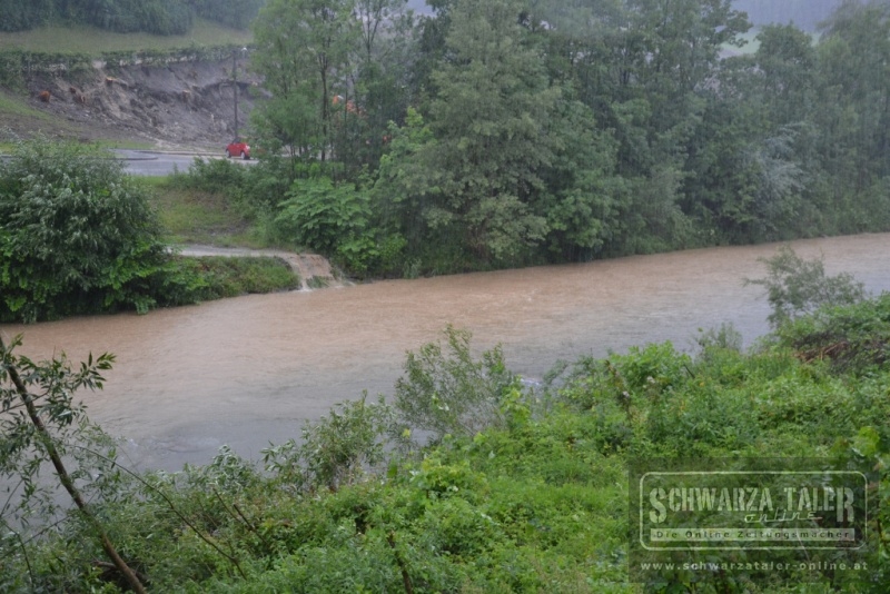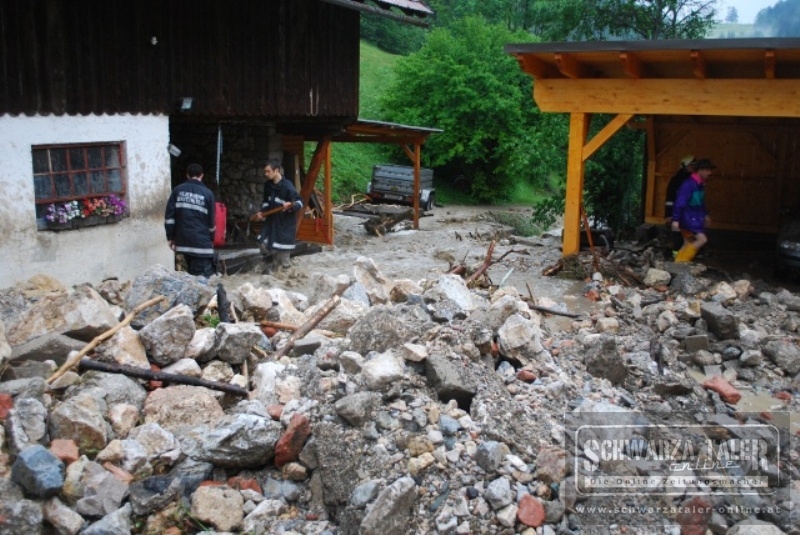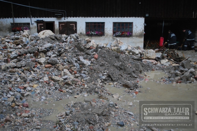 In Breitenstein ging bei einem Bauernhof eine massive Mure ab. Die Geröllmassen verschütten einen Teil der Garage. Schlamm und Geröll staute sich bis zu eineinhalb Meter auf. Verletzt wurde wie durch ein Wunder niemand. Weiters trat ein Bach aufgrund der enormen Regenmengen über die Ufer und überflutete eine Straße.