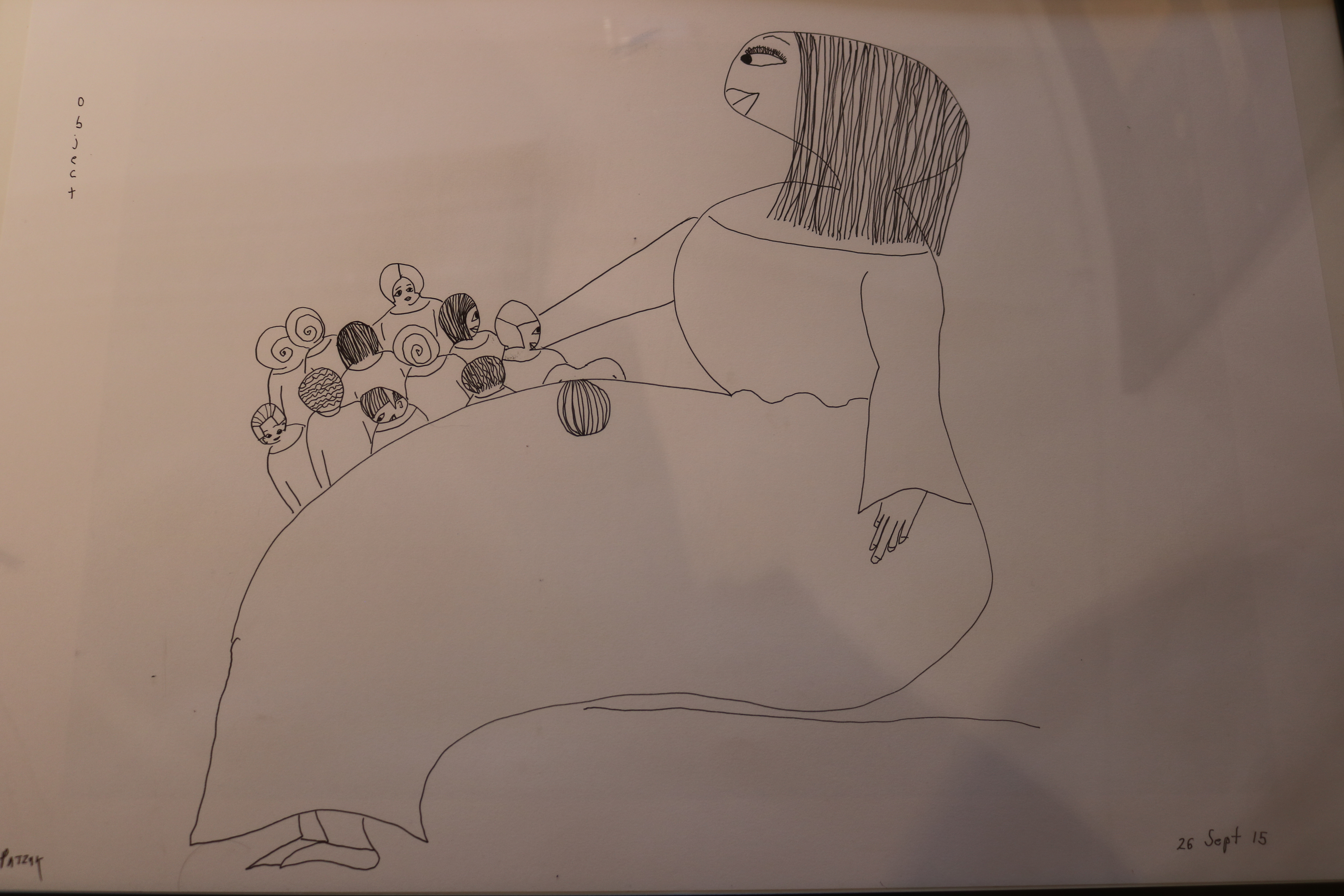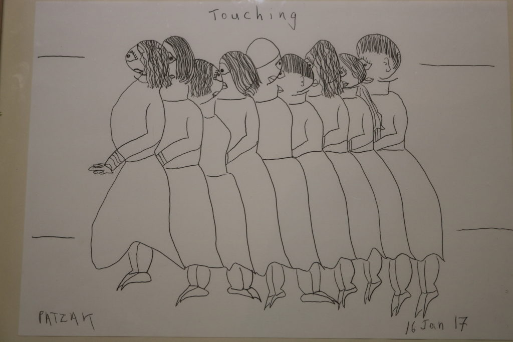 Nach Wien kam die, in New York aufgewachsene, Eve Joy vor mehr als 40 Jahren, um Psychologie zu studieren, lernte in der Doanumetropole Peter Patzak kennen und arbeitete lange Jahre als Leiterin des Kinderhauses in Gugging, das heute das „Haus der Künstler“ beherbergt. Vor fünf Jahren verlor sie durch einen Schlaganfall ihre verbale Sprache. Und begann zu zeichnen: Mit klarem, durchgängigem Strich sind das meist weibliche Figuren, oft in der Rückansicht oder aus der Perspektive von oben, die herausgehoben aus einem Umfeld ganz für sich stehen. Jedes der Gesichter erhält mit wenigen Details einen ganz eigenen Ausdruck: Traurig, besorgt, neugierig, tröstend, fröhlich … ein unglaublicher Nuancenreichtum, der die vielschichtige