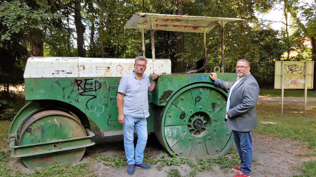 Manfred Mollay von der Stadtgemeinde mit Stadtrat Christian Gruber und der Straßenwalze.