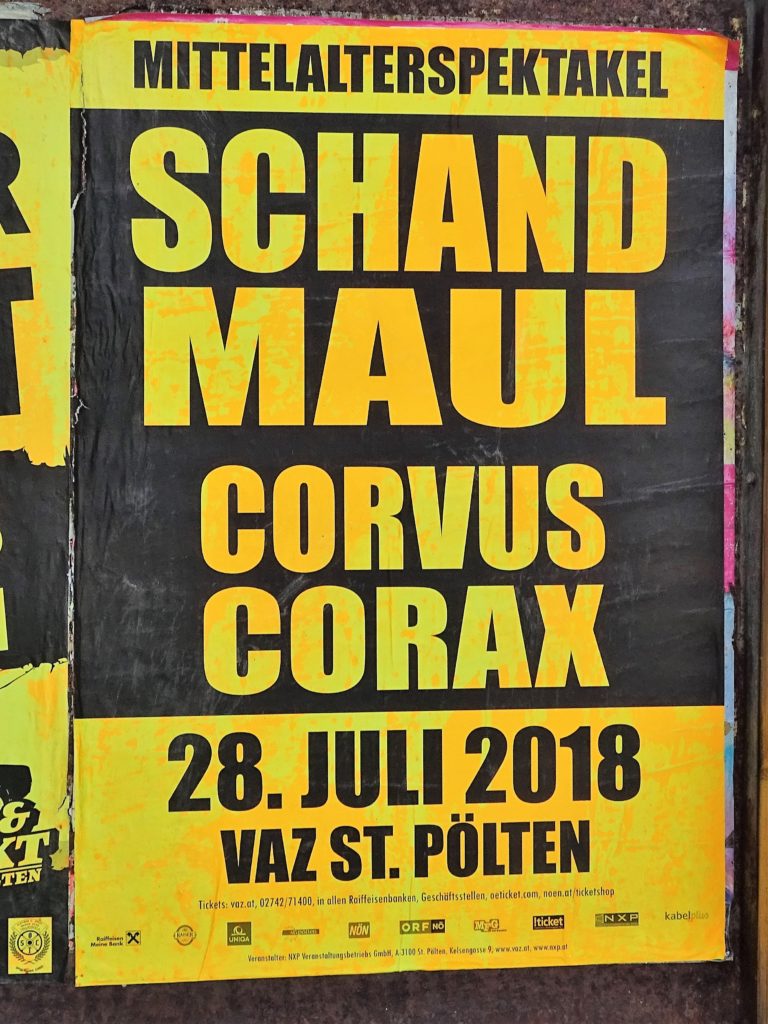 Bei der fünften Auflage des Mittelalterspektakels im VAZ St. Pölten spielten Narrengold, Fuchsteufelswild, Harpyie, Corvus Corax und die Mittelalter-Folk-Rock-Formation Schandmaul, die gleichzeitig ihr 20-jähriges Bühnenjubiläum feierte, vor einer begeisterten Menge auf.