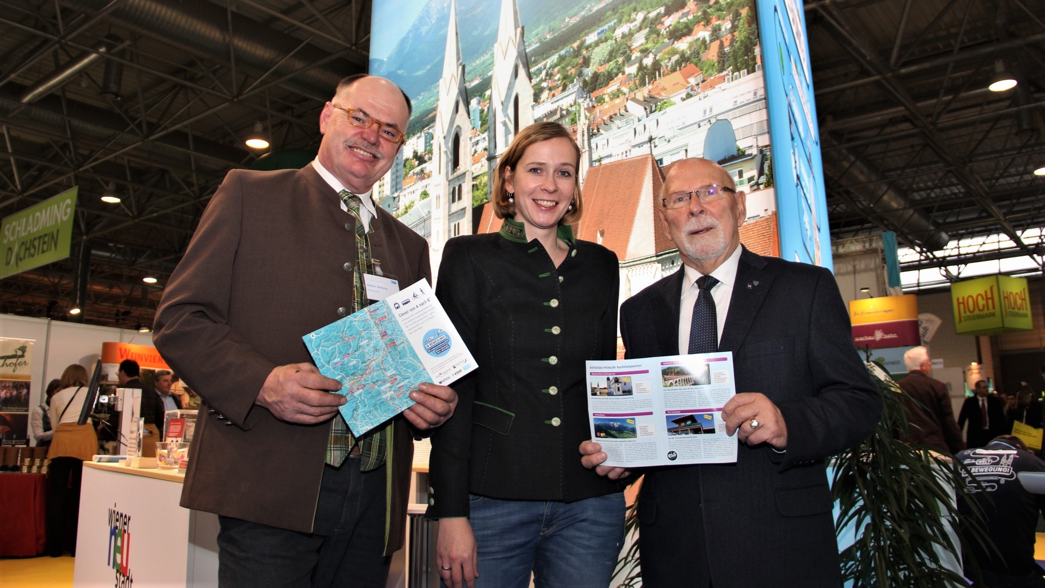 Der Würflacher Vizebürgermeister Johann Woltron, Wibke Strahl-Naderer vom Mobilitätsmanagement Industrieviertel und der Semmeringer Bürgermeister Horst Schröttner (v.l.) mit den Info-Flyern.