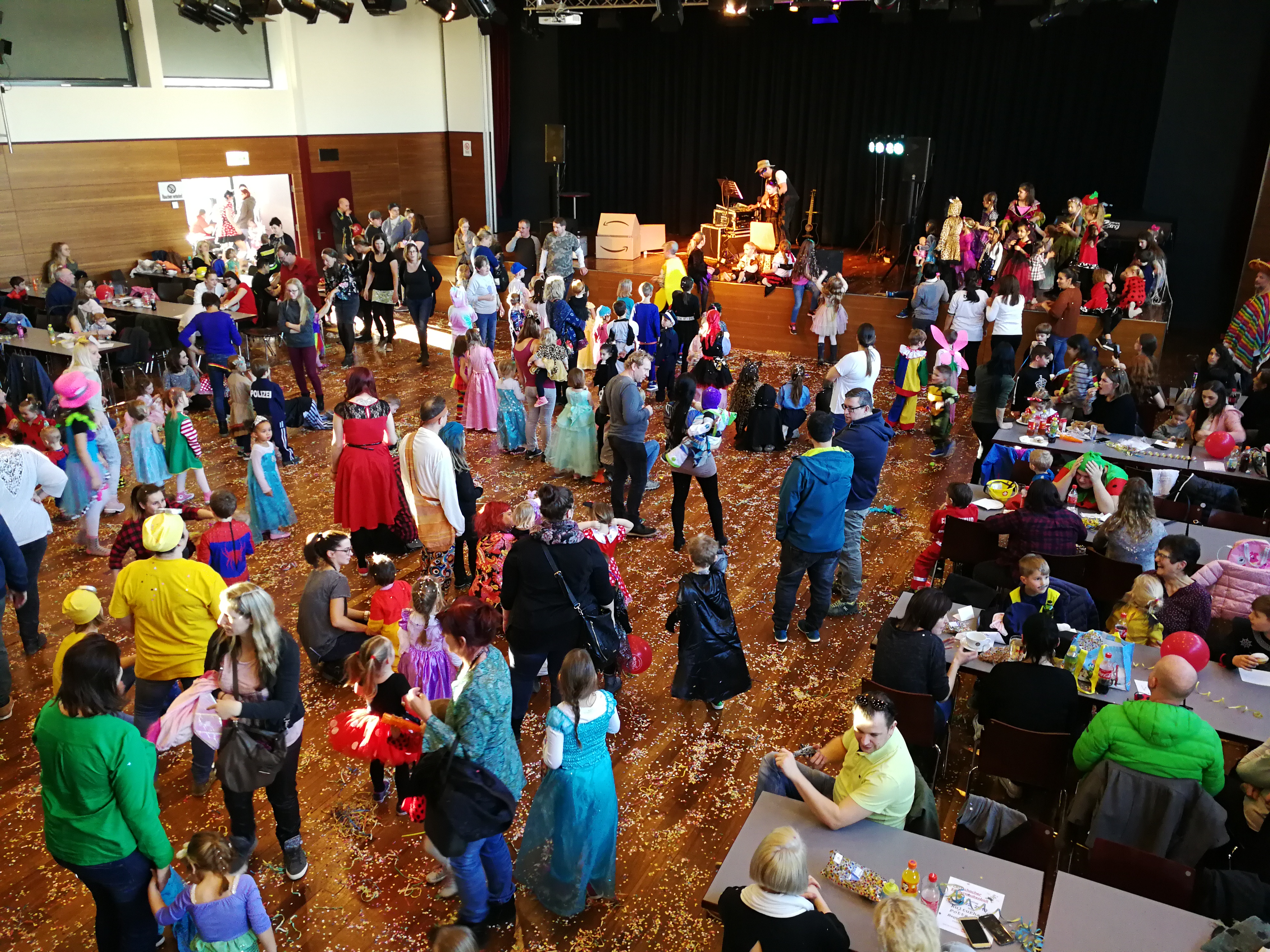 Die Kinder hatten viel Spaß, sprangen, sangen, tanzten und lachten. Feen, Prinzessinnen und Prinzen, PolizistInnen, Cowboys und Cowgirls sowie Piraten, SuperheldInnen und dazwischen maskierte Eltern in ihren phantasievollen Kostümen tummelten sich in der festlich geschmückten Halle.