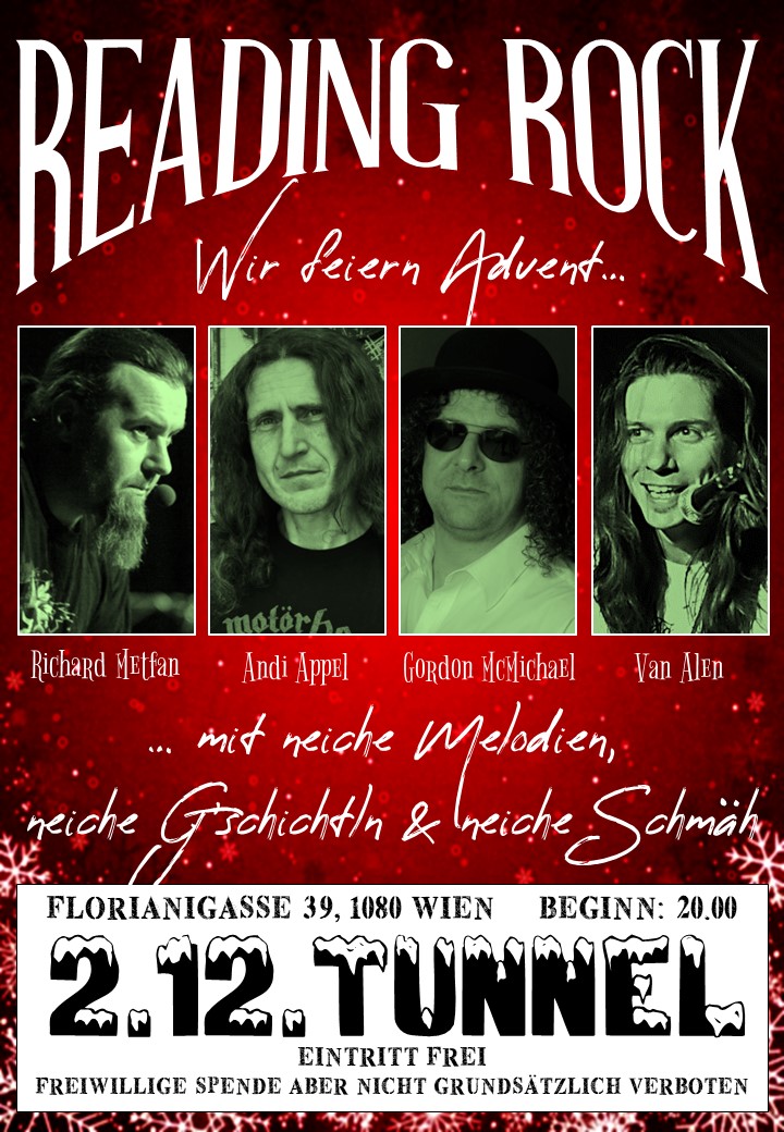Das dritte Reading Rock kündigt sich – erstmals an einem Freitag – schön vorweihnachtlich im Tunnel in Wien (für dein Navi: Florianigasse 39, 1080 Wien, Parkplätze gibz ned, nur eine sauteure Parkgarage in der Nähe und Öffis fahren geht nur maskiert in der Stadt der Maskeraden) an. Mit „neiche Melodien, neiche G´schichtln“ und einem Stargast, der immerhin schon „neben dem Sänger von Metallica… gepinkelt hat“. Richard Metfan tourte mit seinem „ab 18 – Sex & Drugs & Rock´n Roll Kabarett“ erfolgreich durch die Lande und schaffte es bis zur „Talenteschmiede des Quatsch Comedy Clubs“. Als Kolumnist im Ö Ticket Magazin beleidigte er drei Werbekunden in einem Absatz und durfte in Folge wieder für sich selbst schreiben. Wird spannend! Beginn: 20 Uhr. Eintritt Frei, Hutspende
