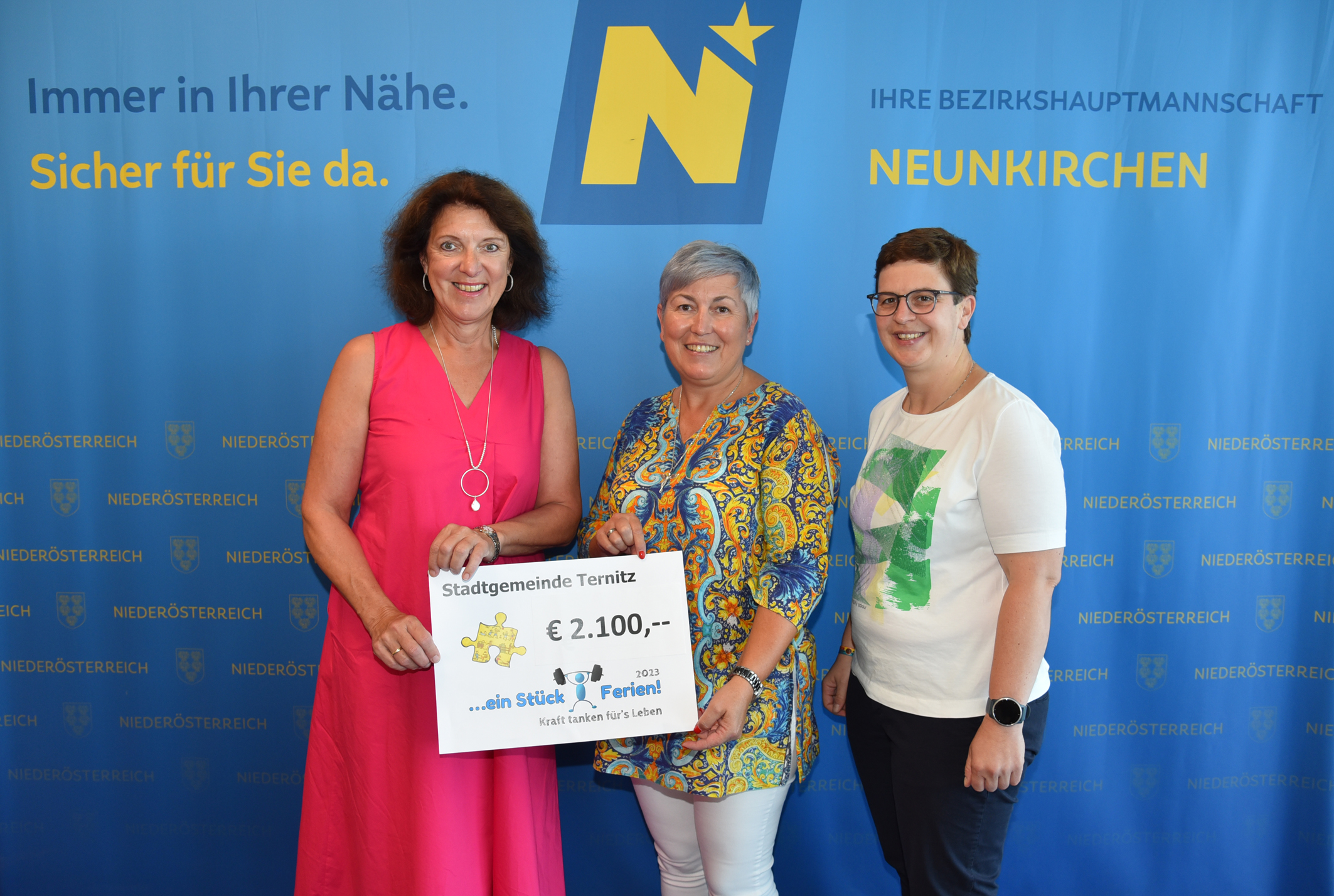 Seit Jahren unterstützen die Stadtgemeinden Neunkirchen und Ternitz die Aktion der Bezirkshauptmannschaft Neunkirchen ‚Ein Stück Ferien‘, die Kindern, die in schwierigen Verhältnissen leben müssen, ein paar unbeschwerte Urlaubstage ermöglicht. Die im Neunkirchner Gemeinderat vertretenen Parteien und die Stadtgemeinde übergaben an Bezirkshauptfrau Alexandra Grabner-Fritz Schecks im Wert von insgesamt €2.010. Der Ternitzer Gemeinderat beschloss ebenfalls, die Ferienaktion der BH Neunkirchen erneut zu fördern und die Kosten für den Aufenthalt von drei Kindern in der Höhe von insgesamt €2.100 zu übernehmen.
