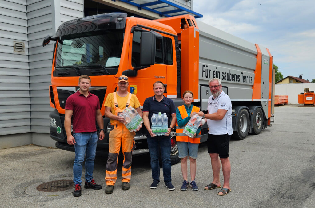 Gemeinsam mit dem für den Städtischen Bauhof zuständigen Stadtrat Gerhard Windbichler brachte Bürgermeister Christian Samwald der Bauhofmannschaft eine Lieferung Mineralwasser um die schweißtreibende Arbeit etwas zu erleichtern.