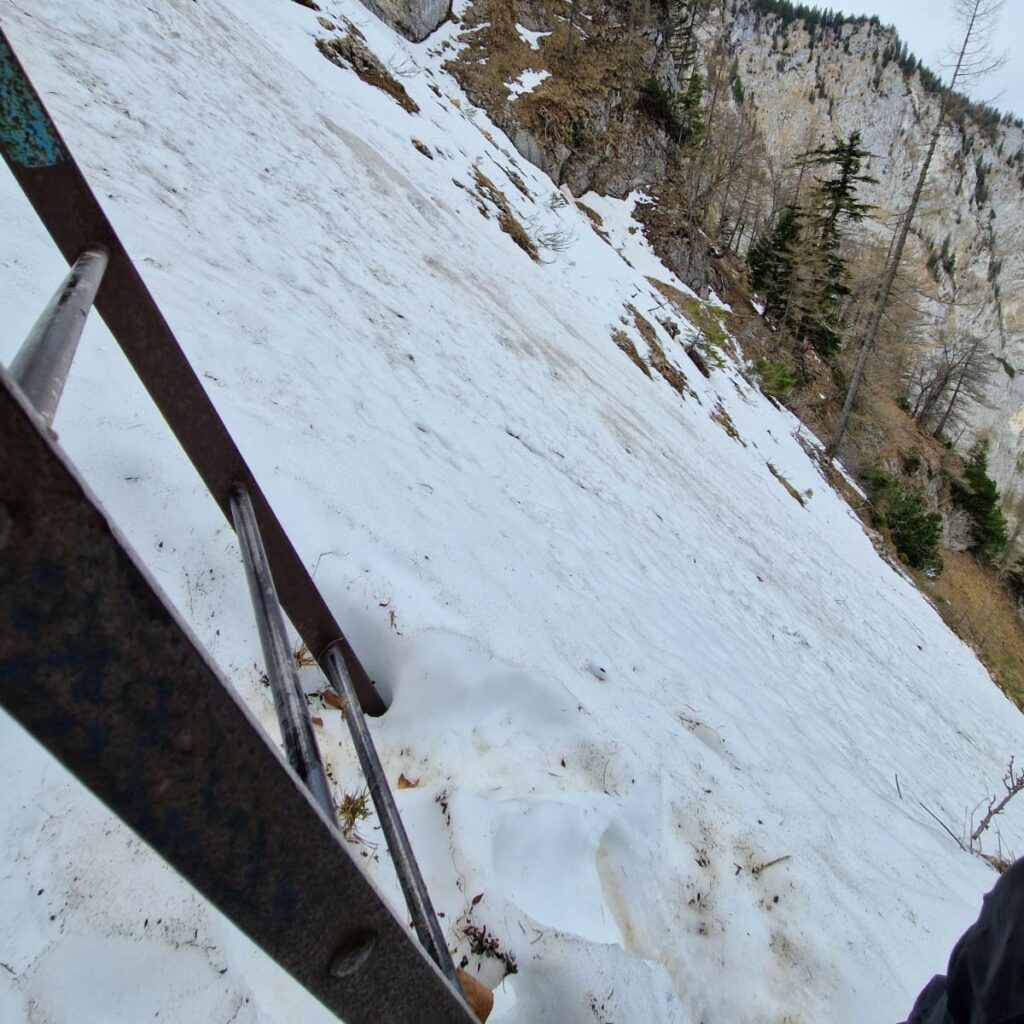 Am Sonntag wurde die Bergrettung Reichenau dann um 16.10 Uhr zu einem weiteren Einsatz gerufen. Ein 49-jähriger Mann gab telefonisch an, dass er am Alpenvereinsteig in Bergnot geraten war. Er konnte aufgrund fehlender Ausrüstung für eine winterliche Begehung nicht mehr weiter und setzte einen Notruf ab (der SCHWARZATALER berichtete). Damit setzte sich die Einsatzserie am Alpenvereinsteig in diesem Frühjahr mit der fünften Alarmierung fort. Jedes Mal wurden die Verhältnisse unterschätzt. Der Steig ist nordseitig bis weit in das Frühjahr hinein mit Schnee und Eis bedeckt und setzt hohe alpine Kompetenz und Technik sowie entsprechende Ausrüstung voraus (unbedingt Steigeisen, Pickel, Helm und Seil!).