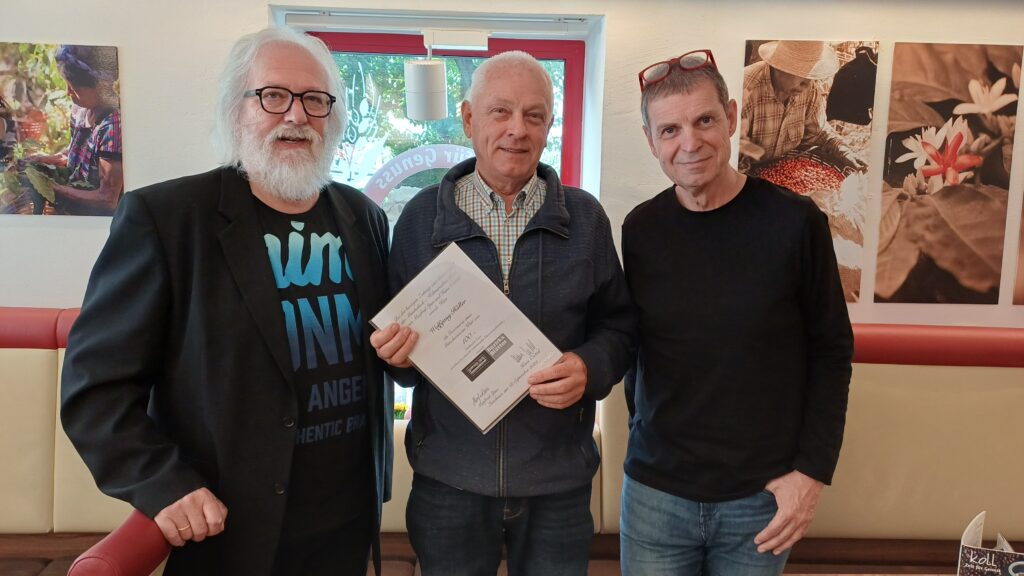 Wolfgang Höller (M.) urlaubte in Paris. Das Musikerduo Hans Czettel (l.) und Manfred Spies (r.) konnte vor wenigen Tagen den Gourmet-Gutschein im Café Koll in Pitten überreichen.