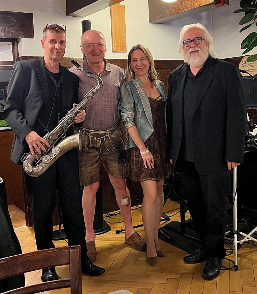 Saxofonist Manfred Spies, Loos-Haus-Wirt Norbert Steiner, Sängerin und Glücksengerl Silvana Moch und Keyboarder und Reiseleiter Hans Czettel beim Abschluss im Loos-Haus.