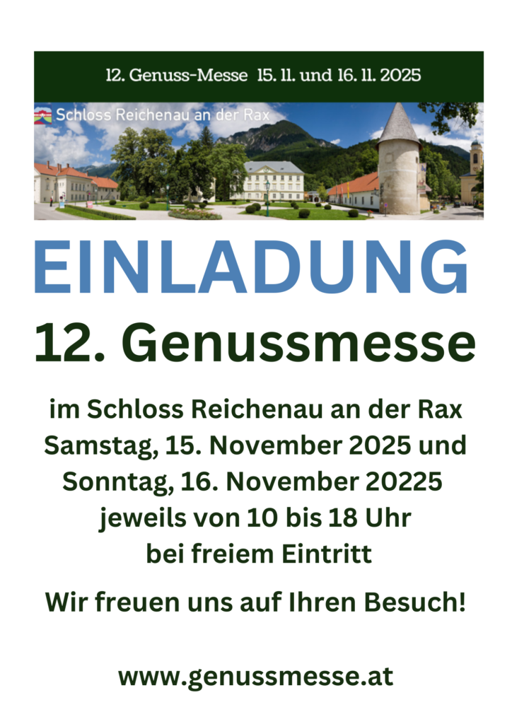 Die Genussmesse im Kulturschloss Reichenau ist mehr als nur eine Messe – sie ist ein Erlebnis für alle Sinne. Tauche ein in eine Welt voller Geschmack, Handwerkskunst und Herzlichkeit. Ob zum Entdecken, Verkosten, Kaufen oder einfach zum Genießen – hier findest du alles, was das Leben schöner macht.
