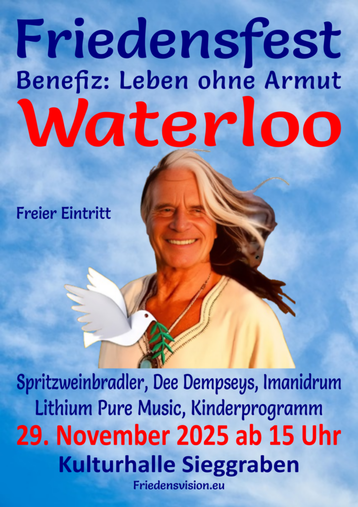 Über Waterloo braucht man nicht viel schreiben, da er ja seit 1974 mit seinem Hit ‚Hollywood‘ Musikgeschichte geschrieben hat. Seit eh und je ist Hansi Kreuzmayr ein Mensch, der für den Frieden auch musikalisch wichtige Zeichen setzt. Wie immer wird er Kinder auf die Bühne bitten, um gemeinsam für den Frieden zu singen. „Gombola Vista“ und „Frieden auf der Welt“ sind die Lieder, die Waterloo mit der Volksschule Sieggraben und anderen Kindern gemeinsam präsentieren wird.