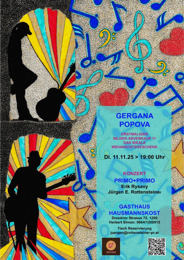 Die in Wien lebende bulgarische Künstlerin Gergana Popova veranstaltet erstmals einen Bilder-Abverkauf. Am 11.11. – allerdings nicht als Faschingsidee, sondern als Gelegenheit für das ideale Weihnachtsgeschenk für alle Kunstliebhaberinnen. Der Event findet in Gerganas gemütlichen Stammlokal, Gasthaus Hausmannskost (für dein Navi: Dresdnerstrasse 72, 1200 Wien) in der Wiener Brigittenau statt. Die Küche von Chef Herbert Simon spielt alle Stücke von österreichischen kulinarischen Köstlichkeiten, musikalische Stücke gibt’s vom Duo Primo+Primo (Primo ist das spanische Wort für Cousin und Jürgen E. Rottensteiner und Erik Rysavy sind tatsächlich Cousins). Sie spielen einen Mix aus Blues, Singer-Songwriter, Pop und Jazz. Beginn: 19:30 / Eintritt frei