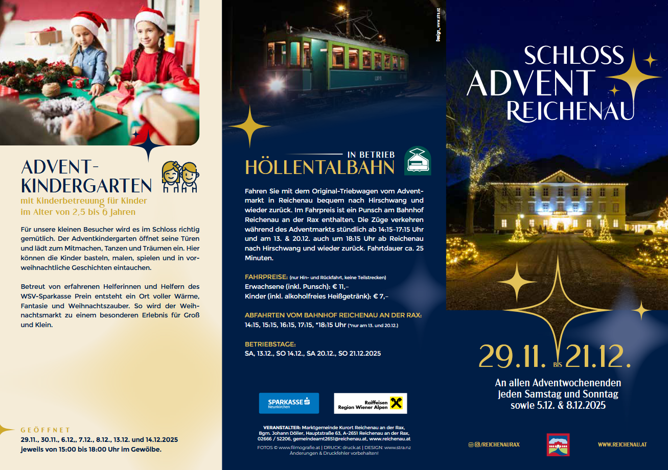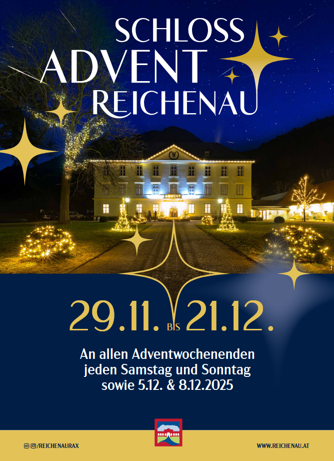 Im Kulturschloss Reichenau findet bis 21. Dezember jeden Samstag und Sonntag ab 14 Uhr wieder der Reichenauer Advent statt, zusätzlich noch am Feiertagsmontag, 8. Dezember ab 14 Uhr. Besondere Highlights des Reichenauer Advents sind das Adventkonzert der Singgemeinschaft Payerbach-Reichenau am kommenden Feiertagsmontag um 16 Uhr in der Pfarrkirche Reichenau und der Alpenländische Advent, der am 21. Dezember ab 16 Uhr im Schloss Reichenau den Reichenauer Advent ausklingen lässt.