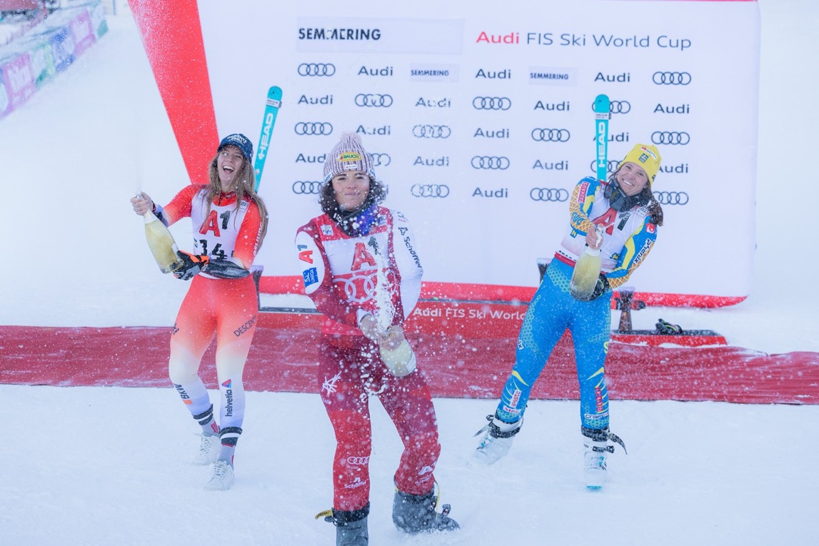 Podestjubel und dreifache Sektdusche: Die Siegerin Julia Scheib (Mitte) mit Camille Rast (l.) und Sara Hector (r.).