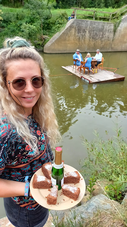 Das wunderbare Lesungsprojekt ‚Anschiffen‘ am Festivalsamstag unter der Intendanz von Christoph F. Krutzler (mit Hut hinten auf dem Floß) lockt hunderte Literaturfans an den Pinkastrand.