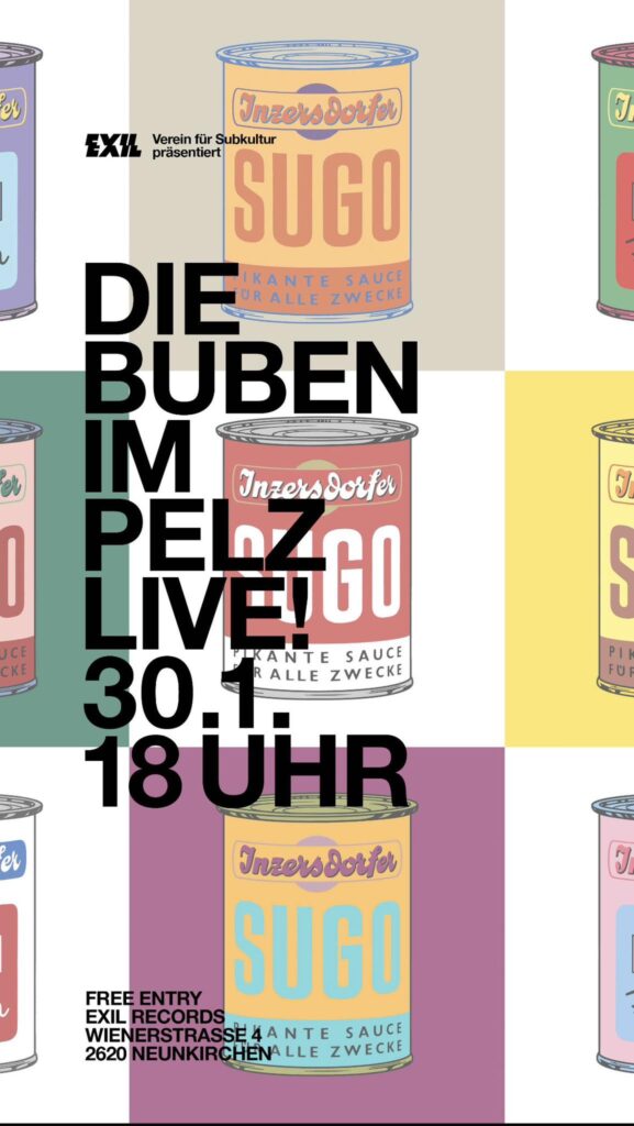 ★ LiKE US ON FACEBOOK ‚Die Buben im Pelz‘ live am 30. Jänner ab 18 Uhr im Exil in Neunkirchen Veröffentlicht am 25. Januar 2026 von CR . Bild ©Exil – Verein für Subkultur ★ LiKE US ON FACEBOOK