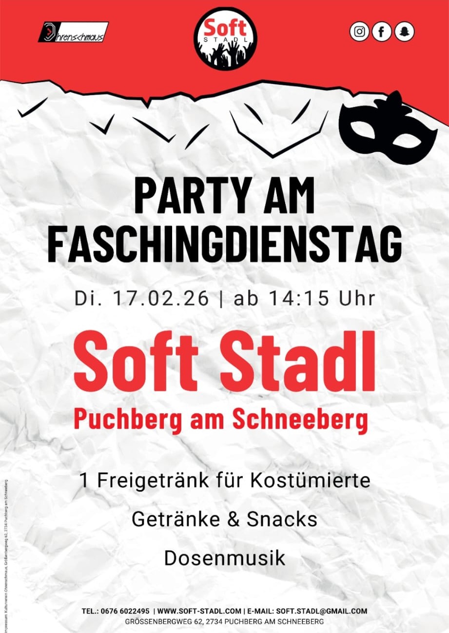 ★ LiKE US ON FACEBOOK ☮️ DER SCHWARZATALER TiPP ★ PARTY AM FASCHiNGSDiENSTAG iM SOFT STADL iN PUCHBERG ☮️ Veröffentlicht am 10. Februar 2026 von CR . . Grafik © Verein Ohrenschmaus ★ LiKE US ON FACEBOOK
