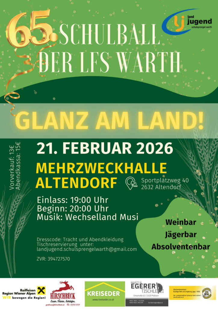 Am 21. Februar lädt der Landjugend Schulsprengel zum 65. Schulball unter dem Motto Glanz am Land in die Mehrzweckhalle in Altendorf (für dein Navi: Sportplatzweg 40, 2632 Altendorf) ein. Der Kartenvorverkauf läuft an der Fachschule Warth (Kontakt unten). Für schwungvolle musikalische Unterhaltung sorgt die Wechselland Musi. An der Weinbar, der Jägerbar und der Absolventenbar können die Gäste den Abend bei guter Stimmung ausklingen lassen. Einlass: 19 Uhr. Beginn: 20 Uhr.