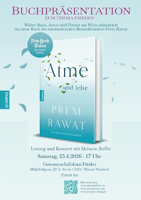 Am Samstag, 25. April, wird die deutschsprachige Ausgabe des neuen Buches Atme und lebe von Prem Rawat im Genossenschaftshaus Frieden, 2351 Wiener Neudorf, Mühlfeldgasse 22. Seiteneingang/1. Stock präsentiert. Das, im Scorpio Verlag erschienene, Buch des international tätigen Friedensbotschafters Prem Rawat beleuchtet die elementare Kraft des Atems als grundlegendes Lebensprinzip. Es liest Ursula Grillmeier-Rehder. Der Reichenauer Komponist und Autor Walter Baco ist am Klavier zu hören. Anschließend kleines Buffet. Beginn: 17 Uhr, Eintritt frei.