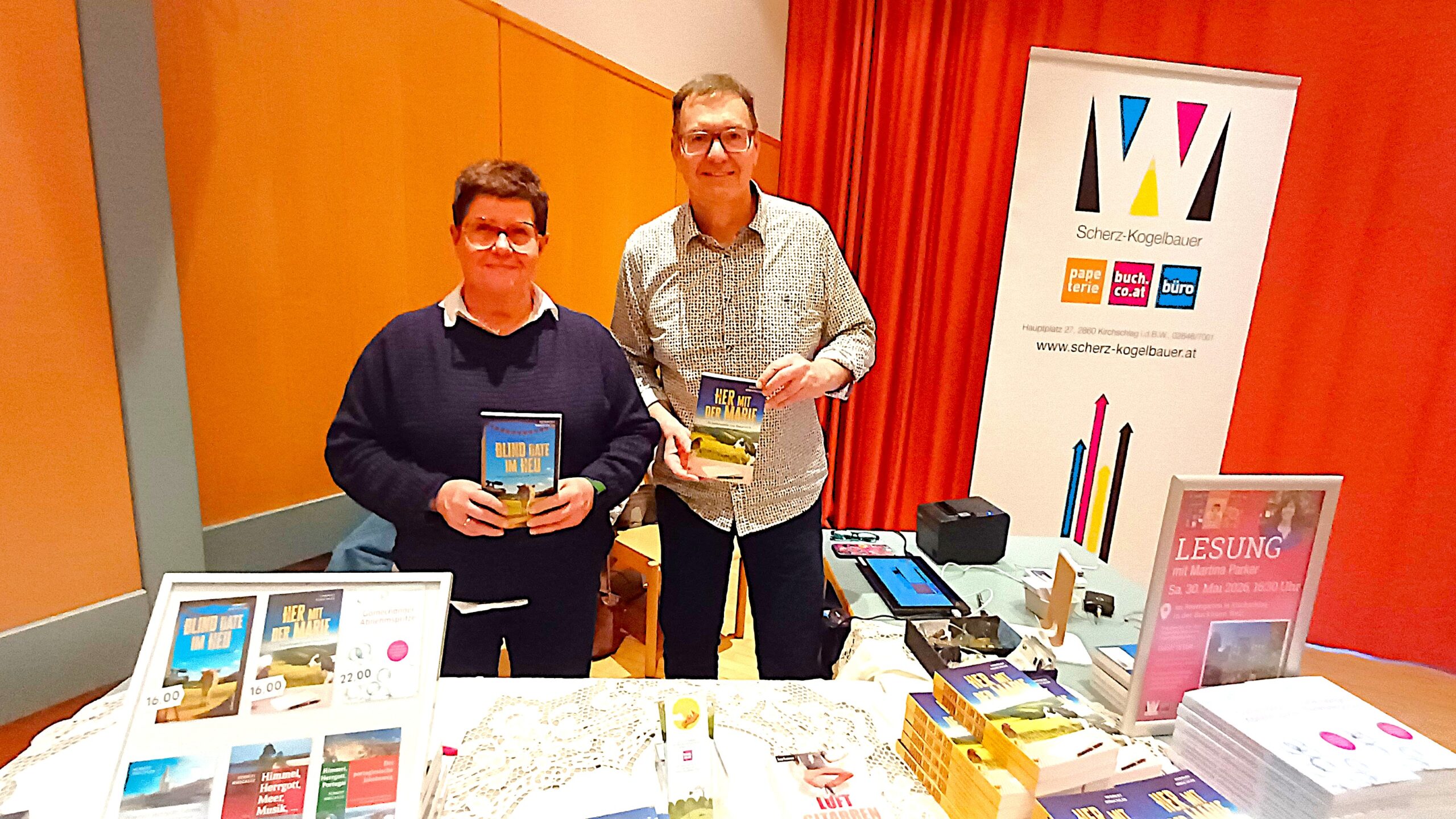 Gabriele Geissl von Scherz-Kogelbauer mit dem neuesten Krimi und dem Autor Herbert Hirschler am Büchertisch im Ternitzer Herrenhaus. Alle Wander- und Krimiwerke von Herbert Hirschler findest du bei Scherz & Kogelbauer oder im Digitalnetz unter www.scherz-kogelbauer.at.