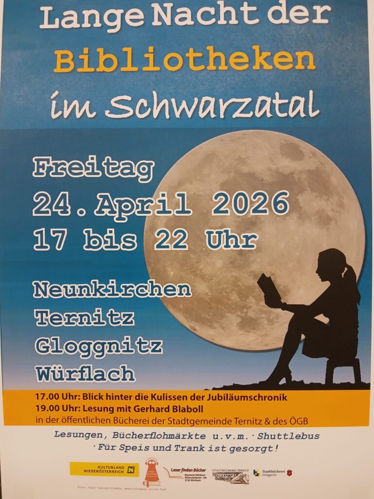 Am morgigen Freitag, 24. April, ist Lange Nacht der Bibliotheken im Schwarzatal. Um 17:00 Uhr erwartet die Stadtbücherei Ternitz Johann Gmeiner vom Film- und Videoclub Ternitz, sowie Maria Posch, Richard Spreitzgrabner und Leo Ascher, die mit Bild- und Filmdokumenten aus ihrem bewegten Leben berichten. Angelehnt ist die Gesprächsrunde an den Film und die Jubiläumschronik „100 Jahre Gemeinde, 75 Jahre Stadt Ternitz”. Um 19.00 Uhr geht es mit einer humoristischen Lesung von Gerhard Blaboll weiter. Der Eintritt ist frei.