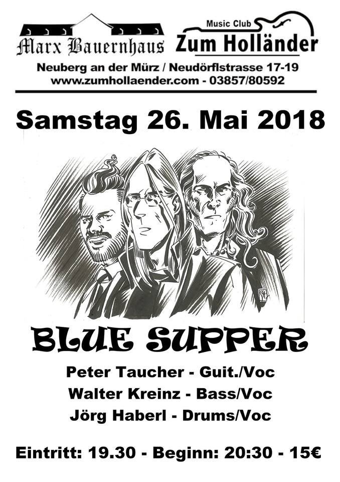 Blue Supper ist ein klassisches Blues&Rock Trio, dessen Wurzeln in den späten 1960er, frühen 1970er Jahren liegen. Am 26. Mai rocken die Drei im Hälländer in Neuberg an der Mürz. Beginn: 20:30 Uhr.