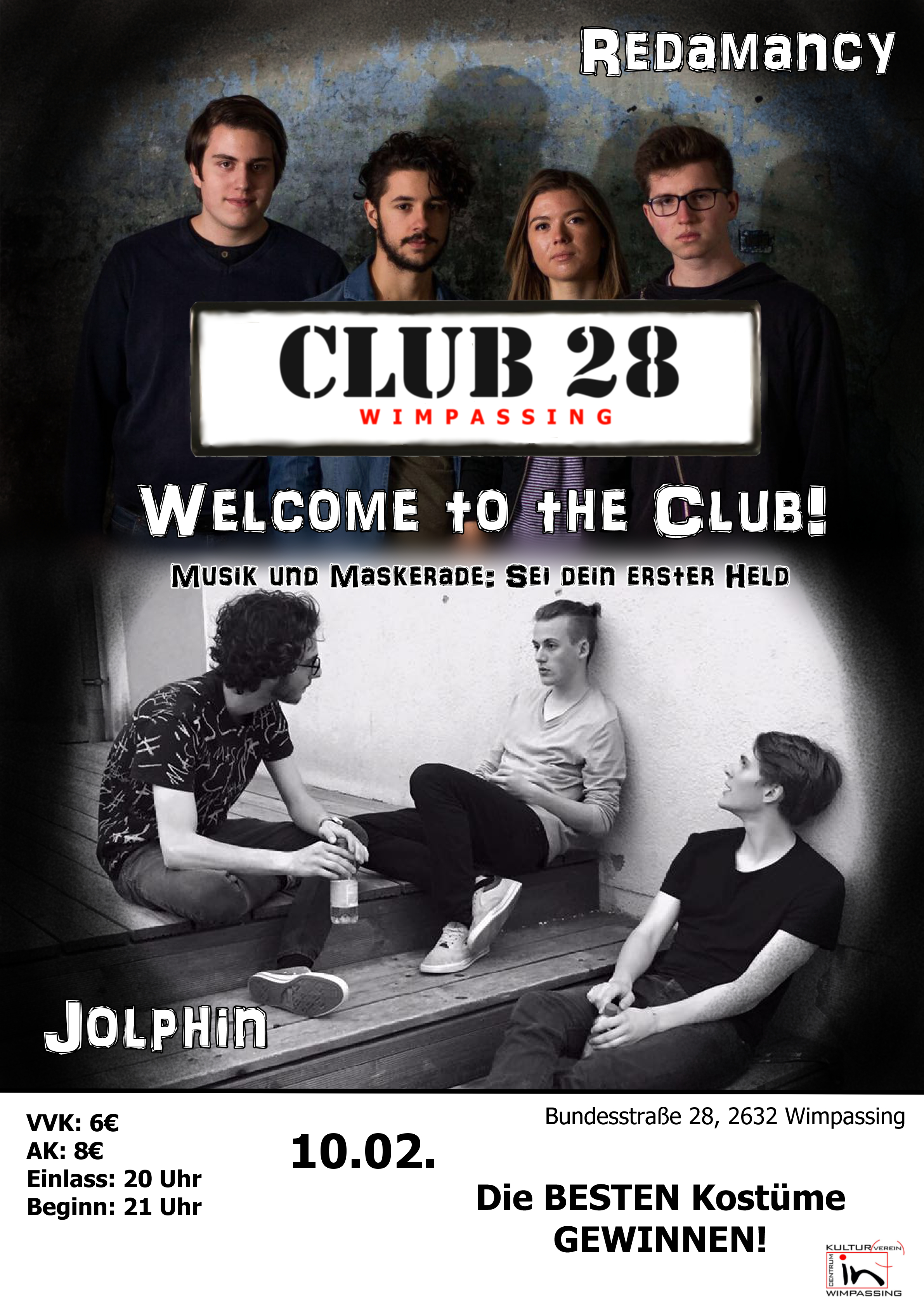 Unter dem Motto „Welcome to the Club“ gibt es Musik & Maskerade, es steigt also ein Konzert mit zwei Bands – Redamancy und Jolphin – samt einem Maskenball, bei dem Kostüme unter dem, Motto „Komm als dein erster Held!“ ausdrücklich erwünscht sind – Die besten Kostüme gewinnen Tickets für kommende Veranstaltungen.